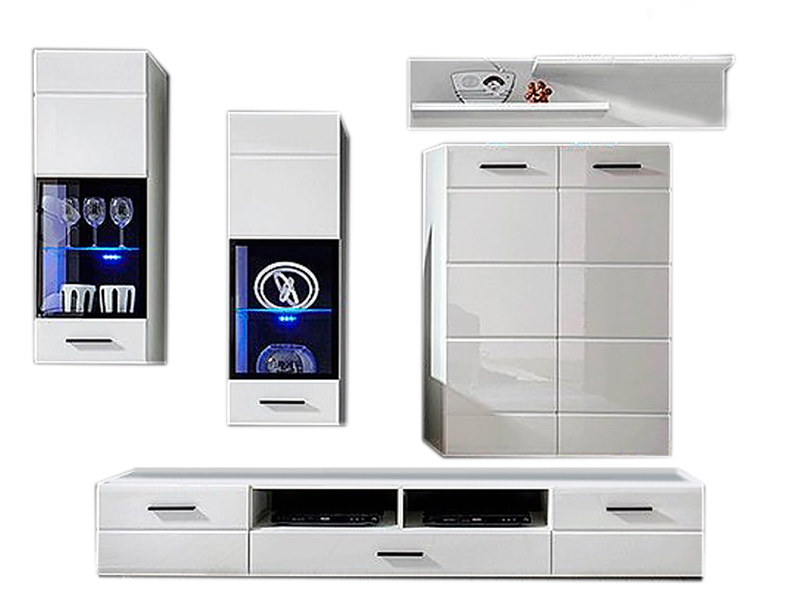 Тумби під телевізор, два навісних пенали (з вітринами), пенал, та підвісної полиці.